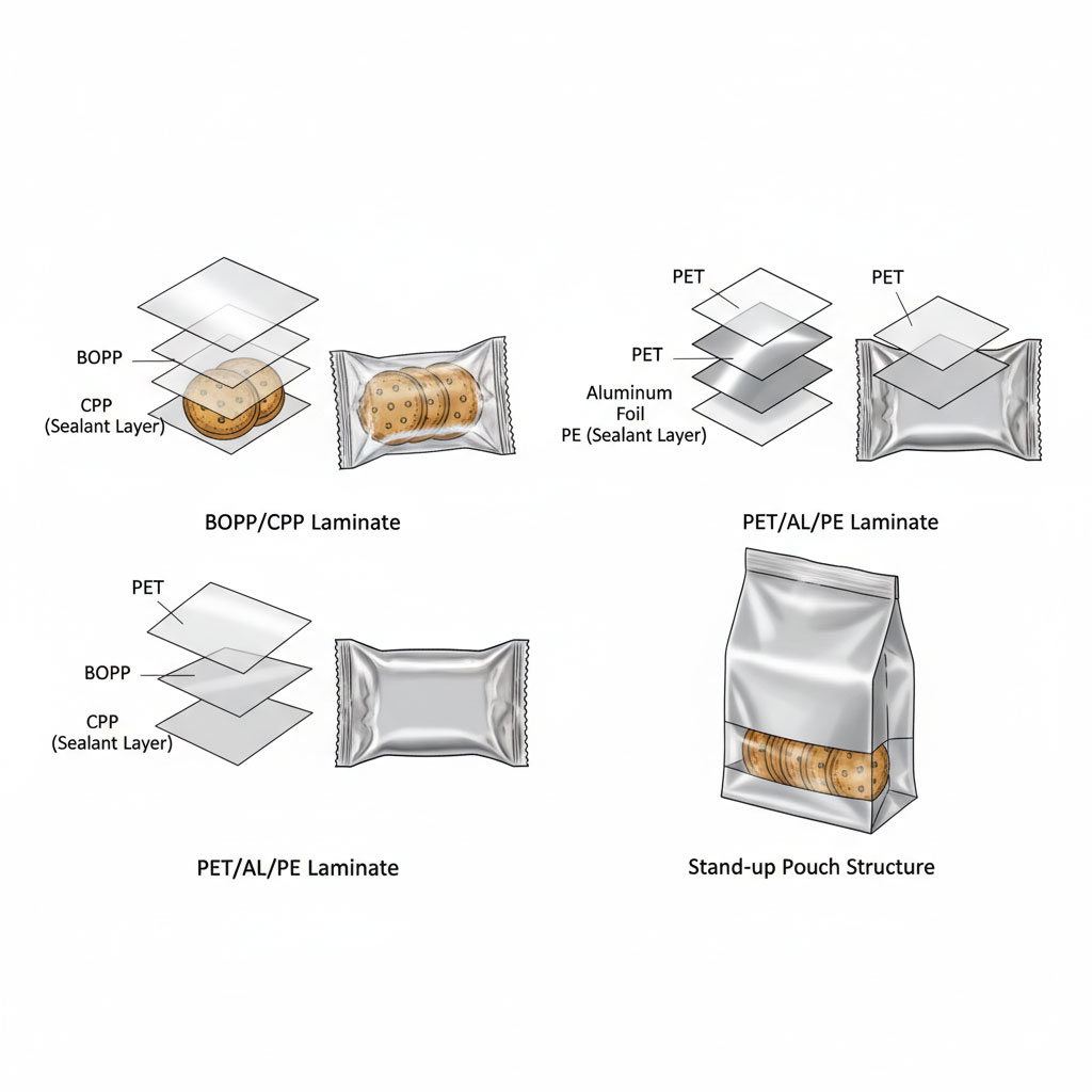 El polipropileno biorientado (BOPP) laminado con polipropileno fundido (CPP) es la estructura de película más utilizada para el envasado de galletas. Ofrece buenas propiedades de barrera contra la humedad, una transparencia adecuada para la visibilidad del producto y un coste relativamente bajo. El BOPP/CPP funciona bien para galletas estándar con una vida útil moderada (de 3 a 6 meses).