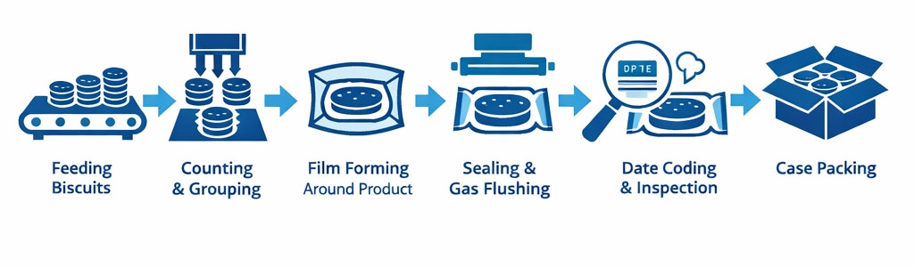 Las funciones básicas son las mismas en la mayoría de los modelos: la máquina recibe las galletas de una línea de producción anterior (o de una estación de alimentación manual), las agrupa o cuenta, las envuelve en film de embalaje, sella el paquete y descarga el producto terminado para su posterior envasado o empaquetado. Los modelos más avanzados incorporan inyección de gas para prolongar la vida útil, codificación de fechas, detección de metales y sistemas de inspección visual.